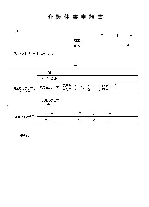 介 護 休 業 申 請 書 殿 年 月 日 所属: 氏名: 印 下記のとおり、申請いたします。 記 介護を必要とする人の状況 氏名 本人との続柄 同居扶養の状況 同居を ( している ・ していない ) 扶養を ( している ・ していない ) 介護を必要とする理由 介護休業の期間 開始日 年 月 日 終了日 年 月 日 その他