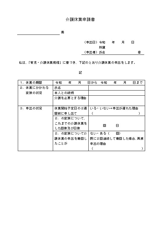 介護休業申請書 殿 (申出日)令和 年 月 日 所属 (申出者)氏名 ㊞ 私は、「育児・介護休業規程」に基づき、下記のとおり介護休業の申出をします。 記 1.休業の期間 令和 年 月 日から 令和 年 月 日まで 2.休業にかかわる 家族の状況 氏名 本人との続柄 介護を必要とする理由 3.申出の状況 休業開始予定日の2週間前に申し出て いる・いない→申出が遅れた理由 ( ) 2.の家族について、これまでの介護休業をした回数及び日数 回 日 2.の家族について介護休業の申出を撤回したことが ない・ある( 回) 既に2回連続して撤回した場合、再度申出の理由 ( )