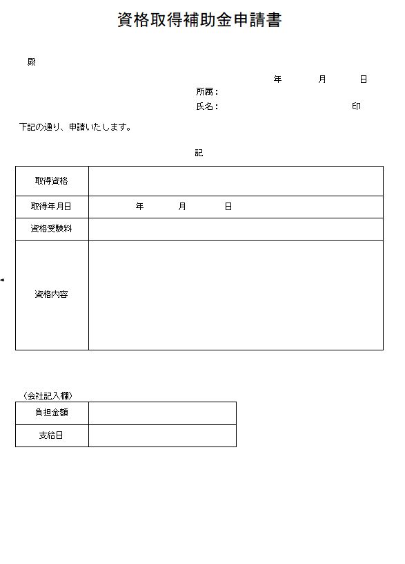 資格取得補助金申請書 殿 年 月 日 所属: 氏名: 印 下記の通り、申請いたします。 記 取得資格 取得年月日 年 月 日 資格受験料 資格内容 (会社記入欄) 負担金額 支給日