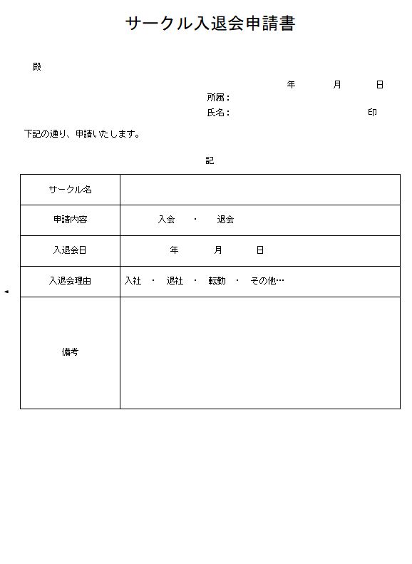サークル入退会申請書 殿 年 月 日 所属: 氏名: 印 下記の通り、申請いたします。 記 サークル名 申請内容 入会 ・ 退会 入退会日 年 月 日 入退会理由 入社 ・ 退社 ・ 転勤 ・ その他… 備考