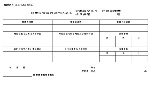 様式第6号(第13条第2項関係) 非常災害等の理由による 労働時間延長 許可申請書 休日労働 届 事業の種類 事業の名称 事業の所在地 時間延長を必要とする事由 時間延長を行う期間及び延長時間 労働者数 男 女 計 休日労働を必要とする事由 休日労働を行う年月日 労働者数 男 女 計 年 月 日 職名 使用者 氏名 ㊞ 労働基準監督署長殿