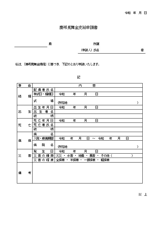 令和 年 月 日 慶弔見舞金支給申請書 殿 所属 (申請人)氏名 ㊞ 私は、「慶弔見舞金規程」に基づき、下記のとおり申請いたします。 記 事由 内容 結婚 配偶者氏名 挙式日・婚姻日 令和 年 月 日 式場 (所在地 ) 出生 出生年月日 令和 年 月 日 出生者名 続柄 死亡 死亡年月日 令和 年 月 日 死亡者氏名 続柄 傷病 病名 入院・療養期間 令和 年 月 日 ~ 令和 年 月 日 病院名 (所在地 ) 災害 発生日 令和 年 月 日 災害の種類 火災 ・ 水害 ・ 地震 ・ 風害 ・ その他( ) 災害の程度 全損壊 ・ 半損壊 ・ 一部損壊 ・ 軽損壊 備考 以 上