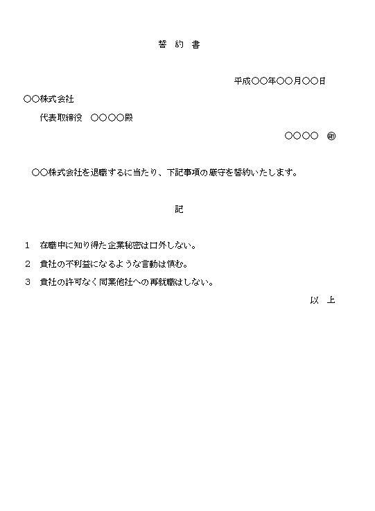 誓 約 書 平成○○年○○月○○日 ○○株式会社 代表取締役 ○○○○殿 ○○○○ ○○株式会社を退職するに当たり、下記事項の厳守を誓約いたします。 記 1 在職中に知り得た企業秘密は口外しない。 2 貴社の不利益になるような言動は慎む。 3 貴社の許可なく同業他社への再就職はしない。 以 上
