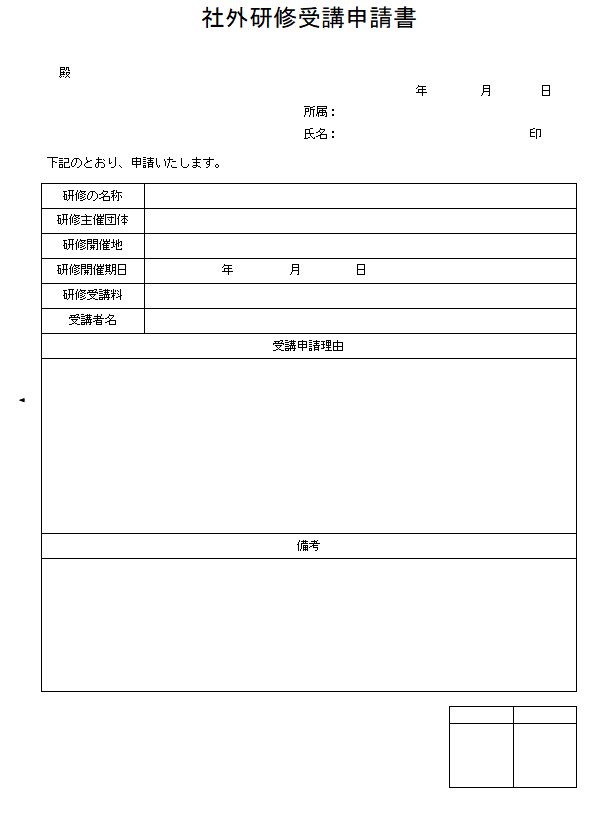 社外研修受講申請書 殿 年 月 日 所属: 氏名: 印 下記のとおり、申請いたします。 研修の名称 研修主催団体 研修開催地 研修開催期日 年 月 日 研修受講料 受講者名 受講申請理由 備考