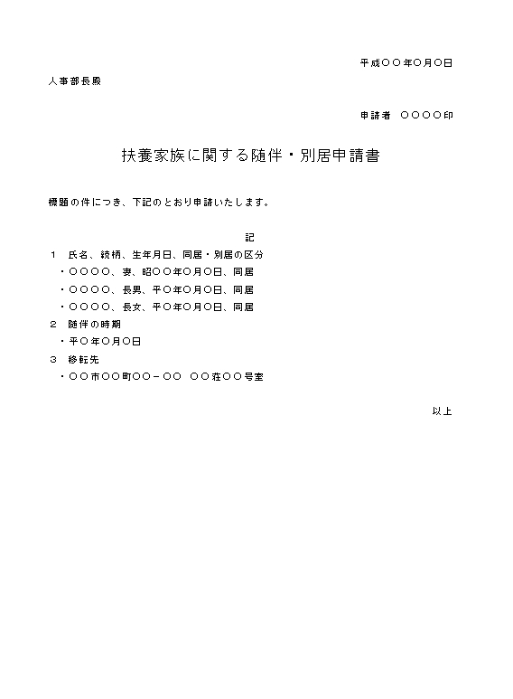 平成○○年○月○日 人事部長殿 申請者 ○○○○印 扶養家族に関する随伴・別居申請書 標題の件につき、下記のとおり申請いたします。 記 1 氏名、続柄、生年月日、同居・別居の区分 ・○○○○、妻、昭○○年○月○日、同居 ・○○○○、長男、平○年○月○日、同居 ・○○○○、長女、平○年○月○日、同居 2 随伴の時期 ・平○年○月○日 3 移転先 ・○○市○○町○○-○○ ○○荘○○号室 以上