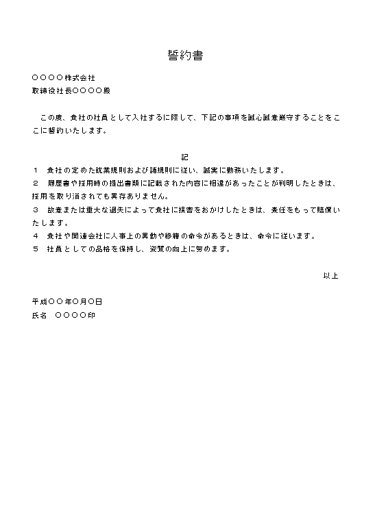 誓約書 ○○○○株式会社 取締役社長○○○○殿 この度、貴社の社員として入社するに際して、下記の事項を誠心誠意厳守することをここに誓約いたします。 記 1 貴社の定めた就業規則および諸規則に従い、誠実に勤務いたします。 2 履歴書や採用時の提出書類に記載された内容に相違があったことが判明したときは、採用を取り消されても異存ありません。 3 故意または重大な過失によって貴社に損害をおかけしたときは、責任をもって賠償いたします。 4 貴社や関連会社に人事上の異動や移籍の命令があるときは、命令に従います。 5 社員としての品格を保持し、資質の向上に努めます。 以上 平成○○年○月○日 氏名 ○○○○印
