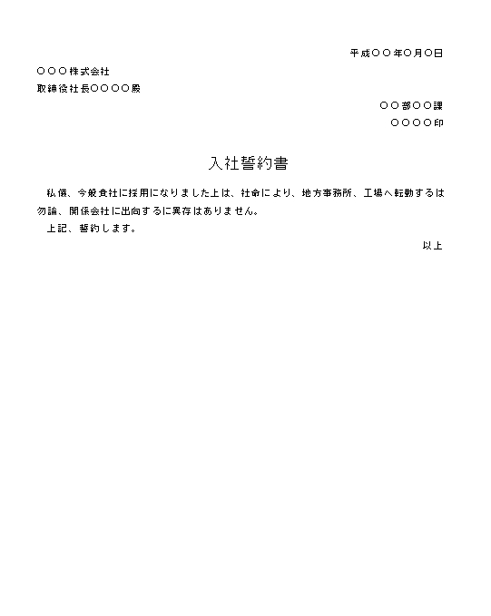平成○○年○月○日 ○○○株式会社 取締役社長○○○○殿 ○○部○○課 ○○○○印 入社誓約書 私儀、今般貴社に採用になりました上は、社命により、地方事務所、工場へ転勤するは勿論、関係会社に出向するに異存はありません。 上記、誓約します。 以上