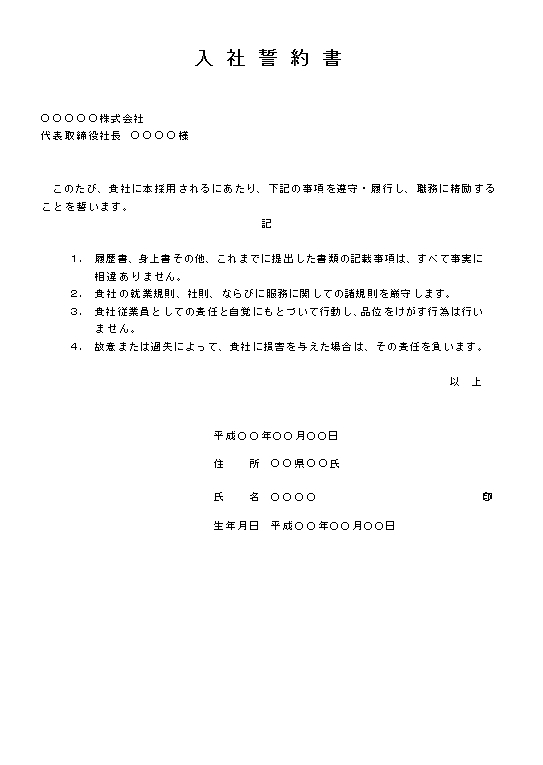 入 社 誓 約 書 ○○○○○株式会社 代表取締役社長 ○○○○様 このたび、貴社に本採用されるにあたり、下記の事項を遵守・履行し、職務に精励することを誓います。 記 1. 履歴書、身上書その他、これまでに提出した書類の記載事項は、すべて事実に相違ありません。 2. 貴社の就業規則、社則、ならびに服務に関しての諸規則を厳守します。 3. 貴社従業員としての責任と自覚にもとづいて行動し、品位をけがす行為は行いません。 4. 故意または過失によって、貴社に損害を与えた場合は、その責任を負います。 以 上 平成〇〇年〇〇月〇〇日 住 所 ○○県○○氏 氏 名 〇〇〇〇 ○印 生年月日 平成〇〇年〇〇月〇〇日