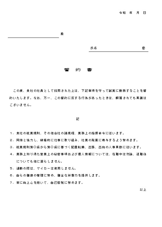 令和 年 月 日 殿 氏名 ㊞ 誓 約 書 この度、貴社の社員として採用された上は、下記事項を守って誠実に勤務することを誓約いたします。なお、万一、この誓約に反する行為があったときは、解雇されても異議はございません。 記 1.貴社の就業規則、その他会社の諸規程、業務上の指揮命令に従います。 2.同僚と協力し、積極的に仕事に取り組み、社業の発展に寄与するよう努めます。 3.就業規則第○条から第○条に基づく配置転換、出張、出向の人事異動に従います。 4.業務上知り得た営業上の秘密事項および個人情報については、在職中は勿論、退職後についても他に漏らしません。 5.通勤の際は、マイカーは使用しません。 6.自らの健康の管理に努め、健全な労働力を提供します。 7.常に向上心を抱いて、自己啓発に努めます。 以上