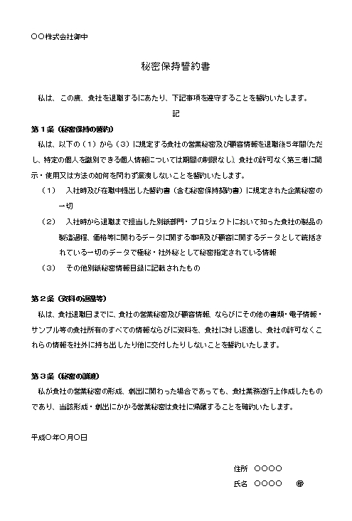 ○○株式会社御中 秘密保持誓約書 私は、この度、貴社を退職するにあたり、下記事項を遵守することを誓約いたします。 記 第1条(秘密保持の誓約) 私は、以下の(1)から(3)に規定する貴社の営業秘密及び顧客情報を退職後5年間(ただし、特定の個人を識別できる個人情報については期間の制限なし)、貴社の許可なく第三者に開示・使用又は方法の如何を問わず漏洩しないことを誓約いたします。 (1) 入社時及び在職中提出した誓約書(含む秘密保持契約書)に規定された企業秘密の一切 (2) 入社時から退職まで担当した別紙部門・プロジェクトにおいて知った貴社の製品の製造過程、価格等に関わるデータに関する事項及び顧客に関するデータとして統括されている一切のデータで極秘・社外秘として秘密指定されている情報 (3) その他別紙秘密情報目録に記載されたもの 第2条(資料の返還等) 私は、貴社退職日までに、貴社の営業秘密及び顧客情報、ならびにその他の書類・電子情報・サンプル等の貴社所有のすべての情報ならびに資料を、貴社に対し返還し、貴社の許可なくこれらの情報を社外に持ち出したり他に交付したりしないことを誓約いたします。 第3条(秘密の譲渡) 私が貴社の営業秘密の形成、創出に関わった場合であっても、貴社業務遂行上作成したものであり、当該形成・創出にかかる営業秘密は貴社に帰属することを確約いたします。 平成○年○月○日 住所 ○○○○ 氏名 ○○○○ ㊞