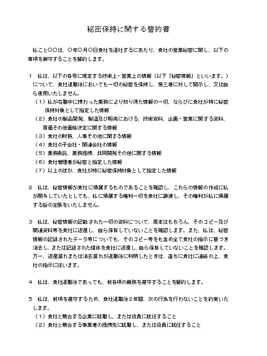 秘密保持に関する誓約書 私こと○○は、○年○月○日貴社を退社するにあたり、貴社の営業秘密に関し、以下の事項を厳守することを誓約します。 1 私は、以下の各号に規定する技術上・営業上の情報(以下「秘密情報」といいます。)について、貴社退職後においても一切の秘密を保持し、第三者に対して開示し、又は自ら使用いたしません。 (1)私が在職中に携わった業務により知り得た情報の一切、ならびに貴社が特に秘密保持対象として指定した情報 (2)貴社の製品開発、製造及び販売における、技術資料、企画・営業に関する資料、原価その他価格決定に関する情報 (3)貴社の財務、人事その他に関する情報 (4)貴社の子会社・関連会社の情報 (5)業務委託、業務提携、共同開発その他に関する情報 (6)貴社管理者が秘密と指定した情報 (7)以上のほか、貴社が特に秘密保持対象として指定した情報 2 私は、秘密情報が貴社に帰属するものであることを確認し、これらの情報の作成に私が関与していたとしても、私に帰属する権利一切を貴社に譲渡し、その権利が私に帰属する旨の主張をいたしません。 3 私は、秘密情報の記載された一切の資料について、原本はもちろん、そのコピー及び関連資料等を貴社に返還し、自ら保有していないことを確認します。また、私は、秘密情報の記録されたデータ等についても、そのコピー等をも含め全て貴社の指示に基づき消去し、または記録された媒体を貴社に返還し、自ら保有していないことを確認します。万一、返還漏れまたは消去漏れが退職後に判明したときは、直ちに貴社に連絡の上、貴社の指示に従います。 4 私は、貴社退職後であっても、前各項の義務を遵守することを誓約します。 5 私は、前項を遵守するため、貴社退職後2年間、次の行為を行わないことを約束いたします。 (1)貴社と競合する企業に就職し、または役員に就任すること (2)貴社と競合する事業者の提携先に就職し、または役員に就任すること (3)貴社と競合する事業を自らまたは第三者をして起業し、または設立すること(第三者と共同して開業等する場合を含む) 6 私は、前項の補償のため、給与および退職金に加え、補償手当として〇〇円の支払を受けました。 20XX年 月 日 住所 氏名 株式会社〇〇 代表取締役 ○○ 殿