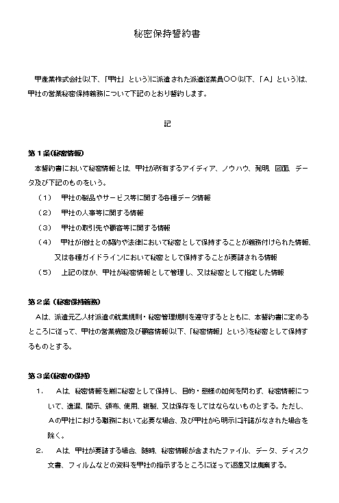 秘密保持誓約書 甲産業株式会社(以下、「甲社」という)に派遣された派遣従業員○○(以下、「A」という)は、甲社の営業秘密保持義務について下記のとおり誓約します。 記 第1条(秘密情報) 本誓約書において秘密情報とは、甲社が所有するアイディア、ノウハウ、発明、図面、データ及び下記のものをいう。 (1) 甲社の製品やサービス等に関する各種データ情報 (2) 甲社の人事等に関する情報 (3) 甲社の取引先や顧客等に関する情報 (4) 甲社が他社との契約や法律において秘密として保持することが義務付けられた情報、又は各種ガイドラインにおいて秘密として保持することが要請される情報 (5) 上記のほか、甲社が秘密情報として管理し、又は秘密として指定した情報 第2条 (秘密保持義務) Aは、派遣元乙人材派遣の就業規則・秘密管理規則を遵守するとともに、本誓約書に定めるところに従って、甲社の営業機密及び顧客情報(以下、「秘密情報」という)を秘密として保持するものとする。 第3条(秘密の保持) 1. Aは、秘密情報を厳に秘密として保持し、目的・態様の如何を問わず、秘密情報について、遺漏、開示、頒布、使用、複製、又は保存をしてはならないものとする。ただし、Aの甲社における職務において必要な場合、及び甲社から明示に許諾がなされた場合を除く。 2. Aは、甲社が要請する場合、随時、秘密情報が含まれたファイル、データ、ディスク文書、フィルムなどの資料を甲社の指示するところに従って返還又は廃棄する。 第4条(秘密保持義務に関連する事項) Aは、甲社の定める関連規定や手続を遵守するものとする。 (1) 営業秘密管理規程 (2) 秘密文書取扱規程 (3) コンピュータ利用規程 (4) 職務発明規程 (5) その他甲社が規定するルール 第5条(秘密保持義務の存続) 秘密保持義務は、Aの派遣期間終了後も○年間存続するものとする。 第6条(違反の場合の措置) Aは、乙人材派遣の就業規則、本誓約書及び第4条に記載の甲社における秘密保持義務に違反した場合、乙人材派遣の就業規則に定める懲戒の対象となる場合があること、及び刑事・民事の法的手続きの対象となる場合があることを了解する。 上記の義務について了解し、下記のとおり署名いたします。 平成○年○月○日 住所 ○○○○ 氏名 ○○ ㊞