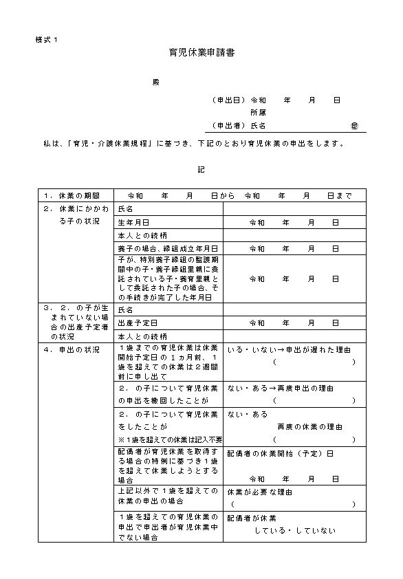 様式1 育児休業申請書 殿 (申出日)令和 年 月 日 所属 (申出者)氏名 ㊞ 私は、「育児・介護休業規程」に基づき、下記のとおり育児休業の申出をします。 記 1.休業の期間 令和 年 月 日から 令和 年 月 日まで 2.休業にかかわる子の状況 氏名 生年月日 令和 年 月 日 本人との続柄 養子の場合、縁組成立年月日 令和 年 月 日 子が、特別養子縁組の監護期間中の子・養子縁組里親に委託されている子・養育里親として委託された子の場合、その手続きが完了した年月日 令和 年 月 日 3.2.の子が生まれていない場合の出産予定者の状況 氏名 出産予定日 令和 年 月 日 本人との続柄 4.申出の状況 1歳までの育児休業は休業開始予定日の1ヵ月前、1歳を超えての休業は2週間前に申し出て いる・いない→申出が遅れた理由 ( ) 2.の子について育児休業の申出を撤回したことが ない・ある→再度申出の理由 ( ) 2.の子について育児休業をしたことが ※1歳を超えての休業は記入不要 ない・ある 再度の休業の理由 ( ) 配偶者が育児休業を取得する場合の特例に基づき1歳を超えて休業しようとする場合 配偶者の休業開始(予定)日 令和 年 月 日 上記以外で1歳を超えての休業の申出の場合 休業が必要な理由 ( ) 1歳を超えての育児休業の申出で申出者が育児休業中でない場合 配偶者が休業 している・していない