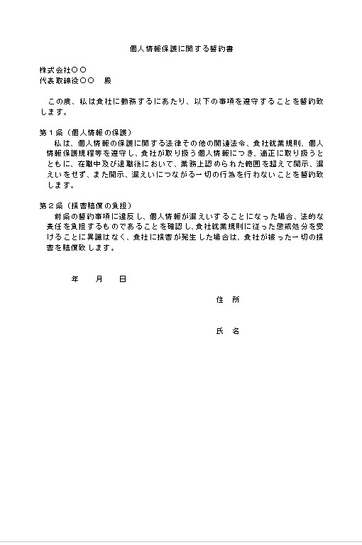 個人情報保護に関する誓約書 株式会社○○ 代表取締役○○ 殿 この度、私は貴社に勤務するにあたり、以下の事項を遵守することを誓約致します。 第1条(個人情報の保護) 私は、個人情報の保護に関する法律その他の関連法令、貴社就業規則、個人情報保護規程等を遵守し、貴社が取り扱う個人情報につき、適正に取り扱うとともに、在職中及び退職後において、業務上認められた範囲を超えて開示、漏えいをせず、また開示、漏えいにつながる一切の行為を行わないことを誓約致します。 第2条(損害賠償の負担) 前条の誓約事項に違反し、個人情報が漏えいすることになった場合、法的な責任を負担するものであることを確認し、貴社就業規則に従った懲戒処分を受けることに異議はなく、貴社に損害が発生した場合は、貴社が被った一切の損害を賠償致します。 年 月 日 住 所 氏 名