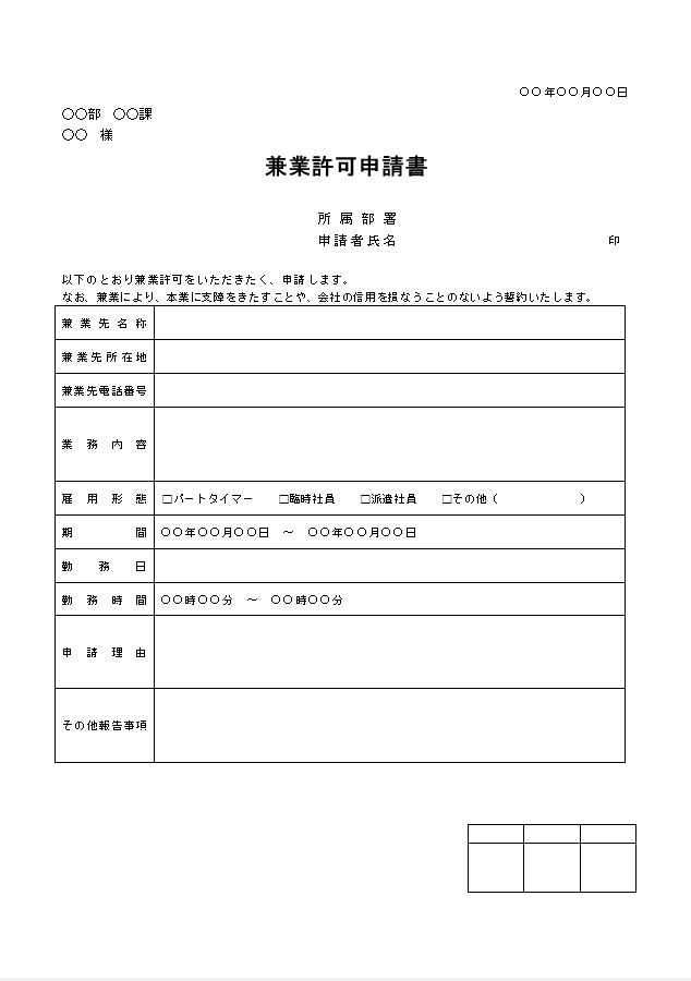 ○○年○○月○○日 ○○部 ○○課 ○○ 様 兼業許可申請書 所属部署 申請者氏名 印 以下のとおり兼業許可をいただきたく、申請します。 なお、兼業により、本業に支障をきたすことや、会社の信用を損なうことのないよう誓約いたします。 兼業先名称 兼業先所在地 兼業先電話番号 業務内容 雇用形態 ☐パートタイマー ☐臨時社員 ☐派遣社員 ☐その他( ) 期間 ○○年○○月○○日 ~ ○○年○○月○○日 勤務日 勤務時間 ○○時○○分 ~ ○○時○○分 申請理由 その他報告事項