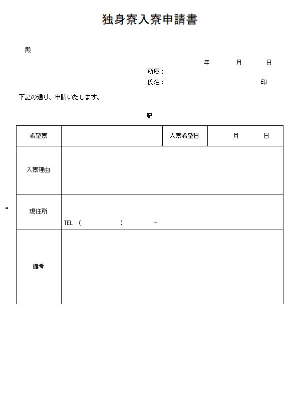 独身寮入寮申請書 殿 年 月 日 所属: 氏名: 印 下記の通り、申請いたします。 記 希望寮 入寮希望日 月 日 入寮理由 現住所 TEL ( ) - 備考
