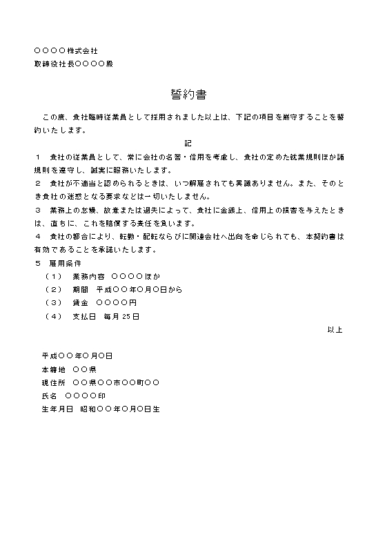 ○○○○株式会社 取締役社長○○○○殿 誓約書 この度、貴社臨時従業員として採用されました以上は、下記の項目を厳守することを誓約いたします。 記 1 貴社の従業員として、常に会社の名誉・信用を考慮し、貴社の定めた就業規則ほか諸規則を遵守し、誠実に服務いたします。 2 貴社が不適当と認められるときは、いつ解雇されても異議ありません。また、そのとき貴社の迷惑となる要求などは一切いたしません。 3 業務上の怠慢、故意または過失によって、貴社に金銭上、信用上の損害を与えたときは、直ちに、これを賠償する責任を負います。 4 貴社の都合により、転勤・配転ならびに関連会社へ出向を命じられても、本契約書は有効であることを承諾いたします。 5 雇用条件 (1) 業務内容 ○○○○ほか (2) 期間 平成○○年○月○日から (3) 賃金 ○○○○円 (4) 支払日 毎月25日 以 上 平成○○年○月○日 本籍地 ○○県 現住所 ○○県○○市○○町○○ 氏名 ○○○○印 生年月日 昭和○○年○月○日生