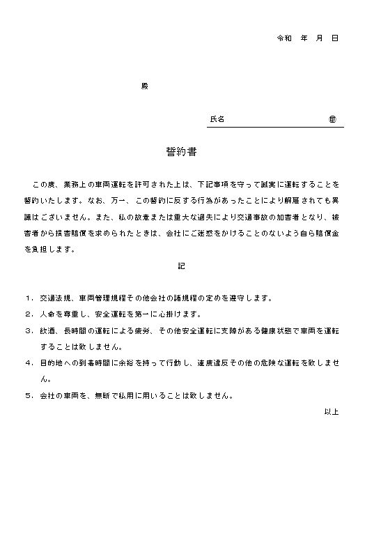 令和 年 月 日 殿 氏名 ㊞ 誓約書 この度、業務上の車両運転を許可された上は、下記事項を守って誠実に運転することを誓約いたします。なお、万一、この誓約に反する行為があったことにより解雇されても異議はございません。また、私の故意または重大な過失により交通事故の加害者となり、被害者から損害賠償を求められたときは、会社にご迷惑をかけることのないよう自ら賠償金を負担します。 記 1.交通法規、車両管理規程その他会社の諸規程の定めを遵守します。 2.人命を尊重し、安全運転を第一に心掛けます。 3.飲酒、長時間の運転による疲労、その他安全運転に支障がある健康状態で車両を運転することは致しません。 4.目的地への到着時間に余裕を持って行動し、速度違反その他の危険な運転を致しません。 5.会社の車両を、無断で私用に用いることは致しません。 以上