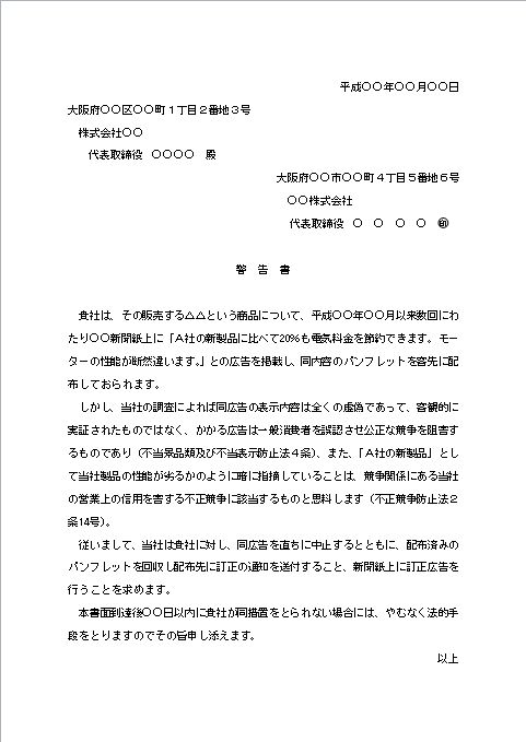 平成○○年○○月○○日 大阪府○○区○○町1丁目2番地3号 株式会社○○ 代表取締役 ○○○○ 殿 大阪府○○市○○町4丁目5番地6号 ○○株式会社 代表取締役 ○ ○ ○ ○ 警 告 書 貴社は、その販売する△△という商品について、平成○○年○○月以来数回にわたり○○新聞紙上に「A社の新製品に比べて20%も電気料金を節約できます。モーターの性能が断然違います。」との広告を掲載し、同内容のパンフレットを客先に配布しておられます。 しかし、当社の調査によれば同広告の表示内容は全くの虚偽であって、客観的に実証されたものではなく、かかる広告は一般消費者を誤認させ公正な競争を阻害するものであり(不当景品類及び不当表示防止法4条)、また、「A社の新製品」として当社製品の性能が劣るかのように暗に指摘していることは、競争関係にある当社の営業上の信用を害する不正競争に該当するものと思料します(不正競争防止法2条14号)。 従いまして、当社は貴社に対し、同広告を直ちに中止するとともに、配布済みのパンフレットを回収し配布先に訂正の通知を送付すること、新聞紙上に訂正広告を行うことを求めます。 本書面到達後○○日以内に貴社が同措置をとられない場合には、やむなく法的手段をとりますのでその旨申し添えます。 以上