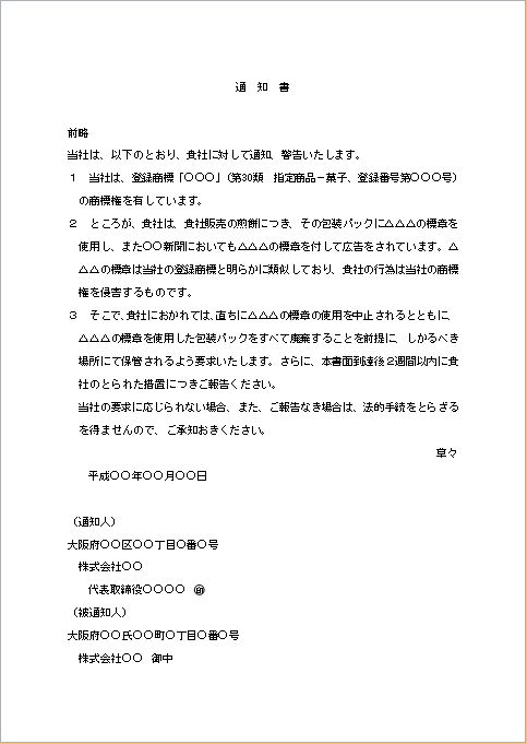 通 知 書 前略 当社は、以下のとおり、貴社に対して通知、警告いたします。 1 当社は、登録商標「○○○」(第30類 指定商品-菓子、登録番号第○○○号)の商標権を有しています。 2 ところが、貴社は、貴社販売の煎餅につき、その包装パックに△△△の標章を使用し、また○○新聞においても△△△の標章を付して広告をされています。△△△の標章は当社の登録商標と明らかに類似しており、貴社の行為は当社の商標権を侵害するものです。 3 そこで、貴社におかれては、直ちに△△△の標章の使用を中止されるとともに、△△△の標章を使用した包装パックをすべて廃棄することを前提に、しかるべき場所にて保管されるよう要求いたします。さらに、本書面到達後2週間以内に貴社のとられた措置につきご報告ください。 当社の要求に応じられない場合、また、ご報告なき場合は、法的手続をとらざるを得ませんので、ご承知おきください。 草々 平成○○年○○月○○日 (通知人) 大阪府○○区○○丁目○番○号 株式会社○○ 代表取締役○○○○ (被通知人) 大阪府○○氏○○町○丁目○番○号 株式会社○○ 御中