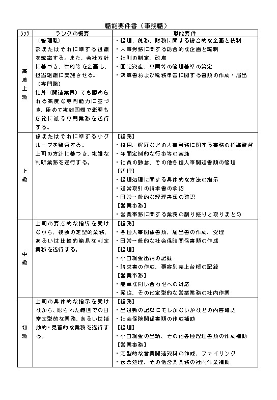 職能要件書(事務職) ランク ランクの概要 職能要件 高 度 上 級 〔管理職〕 部またはそれに準ずる組織を統率する。また、会社方針に基づき、戦略等を企画し、担当組織に実施させる。 〔専門職〕 社外(関連業界)でも認められる高度な専門能力に基づき、極めて複雑困難で影響も広範に渡る専門業務を遂行する。 ・経理、税務、財務に関する総合的な企画と統制 ・人事労務に関する総合的な企画と統制 ・社則の制定、改廃 ・固定資産、車両等の管理基準の策定 ・決算書および税務申告に関する書類の作成・届出 上 級 係またはそれに準ずる小グループを監督する。 上司の方針に基づき、複雑な判断業務を遂行する。 【総務】 ・採用、解雇などの人事労務に関する事務の指導監督 ・年間定例的な行事等の実施 ・社員の勤怠、その他各種人事関連書類の管理 【経理】 ・経理処理に関する具体的な方法の指示 ・通常取引の請求書の承認 ・日常一般的な経理書類の確認 【営業事務】 ・営業事務に関する業務の割り振りと取りまとめ 中 級 上司の要点的な指導を受けながら、複数の定型的業務、あるいは比較的簡易な判定業務を遂行する。 【総務】 ・各種人事関係書類、届出書の作成、受理 ・日常一般的な社会保険関係書類の作成 【経理】 ・小口現金出納の記録 ・請求書の作成、顧客別売上台帳の記録 【営業事務】 ・簡単な問い合わせへの対応 ・発注、その他定型的な営業業務の社内作業 初 級 上司の具体的な指示を受けながら、限られた範囲での日常定型的な業務、あるいは補助的・見習的な業務を遂行する。 【総務】 ・出退勤の記録にモレがないかなどの内容確認 ・社会保険関係書類の作成補助 【経理】 ・小口現金の出納、その他各種経理書類の作成補助 【営業事務】 ・定型的な営業関連資料の作成、ファイリング ・伝票処理、その他営業業務の社内作業補助