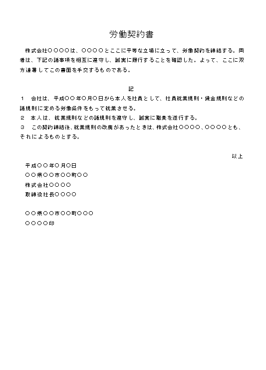 労働契約書 株式会社○○○○は、○○○○とここに平等な立場に立って、労働契約を締結する。両者は、下記の諸事項を相互に遵守し、誠実に履行することを確認した。よって、ここに双方連署してこの書面を手交するものである。 記 1 会社は、平成○○年○月○日から本人を社員として、社員就業規則・賃金規則などの諸規則に定める労働条件をもって就業させる。 2 本人は、就業規則などの諸規則を遵守し、誠実に職責を遂行する。 3 この契約締結後、就業規則の改廃があったときは、株式会社○○○○、○○○○とも、それによるものとする。 以上 平成○○年○月○日 ○○県○○市○○町○○ 株式会社○○○○ 取締役社長○○○○ ○○県○○市○○町○○○ ○○○○印