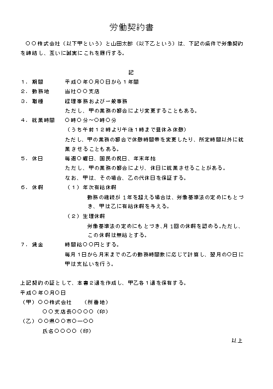 労働契約書 ○○株式会社(以下甲という)と山田太郎(以下乙という)は、下記の条件で労働契約を締結し、互いに誠実にこれを履行する。 記 1.期間 平成○年○月○日から1年間 2.勤務地 当社○○支店 3.職種 経理事務および一般事務 ただし、甲の業務の都合により変更することもある。 4.就業時間 ○時○分~○時○分 (うち午前12時より午後1時まで昼休み休憩) ただし、甲の業務の都合で休憩時間帯を変更したり、所定時間以外に就業させることもある。 5.休日 毎週○曜日、国民の祝日、年末年始 ただし、甲の業務の都合により、休日に就業させることがある。 なお、甲は、その場合、乙の代休日を保証する。 6.休暇 (1)年次有給休暇 勤務の継続が1年を超える場合は、労働基準法の定めにもとづき、甲は乙に有給休暇を与える。 (2)生理休暇 労働基準法の定めにもとづき、月1回の休暇を認める。ただし、この休暇は無給とする。 7.賃金 時間給○○円とする。 毎月1日から月末までの乙の勤務時間数に応じて計算し、翌月の○日に甲は支払いを行う。 上記契約の証として、本書2通を作成し、甲乙各1通を保有する。 平成○年○月○日 (甲)○○株式会社 (所番地) ○○支店長○○○○(印) (乙)○○県○○市○―○○ 氏名○○○○(印) 以上