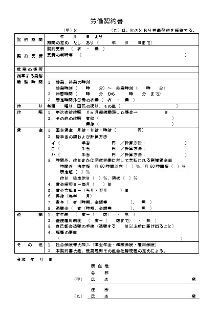 労働契約書 (甲)と (乙)は、次のとおり労働契約を締結する。 契約期間 年 月 日 より 期間の定め なし あり( 年 月 日まで) 契約更新 契約更新 ( 有 ・ 無 ) 更新の判断等 ( ) 就業の場所 従事する業務 勤務時間 1.始業、終業の時刻 始業時刻( 時 分)~ 終業時刻( 時 分) 2.休憩時間( 時 分 から 時 分 まで) 3.所定時間外労働の有無( 有 ・ 無 ) 休日 毎週 曜日、国民の祝日、その他( ) 休暇 1.年次有給休暇 6ヵ月継続勤務した場合→ 日 2.その他の休暇 有給( ) 無給( ) 賃金 1.基本賃金 月給・日給・時給( 円) 2.諸手当の額および計算方法 イ( 手当 円 /計算方法: ) ロ( 手当 円 /計算方法: ) ハ( 手当 円 /計算方法: ) 3.時間外、休日または深夜労働に対して支払われる割増賃金率 時間外 法定超 月60時間以内( )%、月60時間超( )% 所定超( )% 休日 法定休日( )%、深夜( )% 4.賃金締切日-毎月( )日 5.賃金支払日-(当月・翌月 )日 6.昇給(毎年 月) 7.賞与( 有(時期、金額等 ), 無 ) 8.退職金( 有(時期、金額等 ), 無 ) 退職 1.定年制 ( 有-( 歳) ・ 無 ) 2.継続雇用制度 ( 有-( 歳まで) ・ 無 ) 3.自己都合退職の手続(退職する 日以上前に届け出ること) 4.解雇の事由 ( ) その他 1.社会保険等の加入(厚生年金・健康保険・雇用保険) 2.本契約書の他、就業規則その他会社諸規程の定めによる。 令和 年 月 日 所 在 地 名 称 (甲) 氏 名 ㊞ 住 所 (乙) 氏 名 ㊞