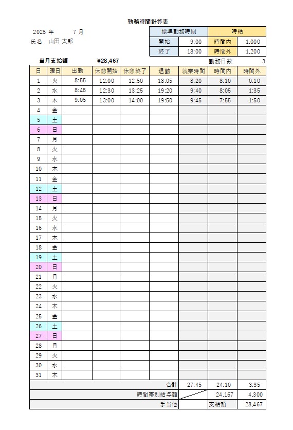 勤務時間計算表 2025 年 7 月 標準勤務時間 時給 氏名 山田 太郎 開始 9:00 時間内 1,000 終了 18:00 時間外 1,200 当月支給額 ¥28,467 勤務日数 3 日 曜日 出勤 休憩開始 休憩終了 退勤 就業時間 時間内 時間外 1 火 8:55 12:00 12:50 18:05 8:20 8:10 0:10 2 水 8:45 12:30 13:25 19:20 9:40 8:05 1:35 3 木 9:05 13:00 14:00 19:50 9:45 7:55 1:50 4 金 5 土 6 日 7 月 8 火 9 水 10 木 11 金 12 土 13 日 14 月 15 火 16 水 17 木 18 金 19 土 20 日 21 月 22 火 23 水 24 木 25 金 26 土 27 日 28 月 29 火 30 水 31 木 合計 27:45 24:10 3:35 時間帯別給与額 24,167 4,300 手当他 支給額 28,467