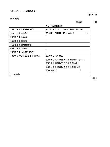 年 月 日 所属長宛 (氏名) ○印 クレーム情報報告 1.クレームを受けた日時 年 月 日( ) 午前·午後 時 分 2.クレームの方法 □来店 □電話 □その他( ) 3.お客さまの氏名 4.お客さまの住所 5.お客さまの電話番号 6.クレームの内容 7.お客さまへの説明内容 8.説明に対するお客さまの対応 □納得してくれた □納得してくれたが、不満が残っていた □あまり納得してもらえなかった □まったく納得してもらえなかった □その他( ) 9. その他 以上