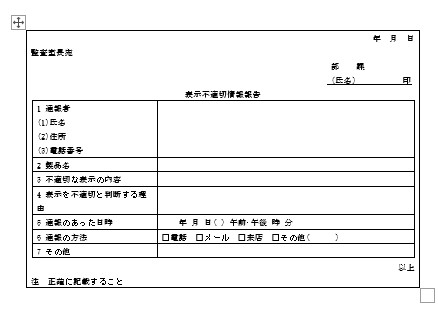 年 月 日 監査室長宛 部 課 (氏名) 印 表示不適切情報報告 1 通報者 (1)氏名 (2)住所 (3)電話番号 2 製品名 3 不適切な表示の内容 4 表示を不適切と判断する理由 5 通報のあった日時 年 月 日( ) 午前·午後 時 分 6 通報の方法 □電話 □メール □来店 □その他( ) 7 その他 以上 注 正確に記載すること