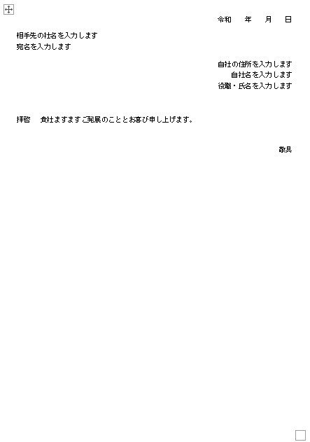 令和 年 月 日 相手先の社名を入力します 宛名を入力します 自社の住所を入力します 自社名を入力します 役職・氏名を入力します 拝啓 貴社ますますご発展のこととお喜び申し上げます。 敬具