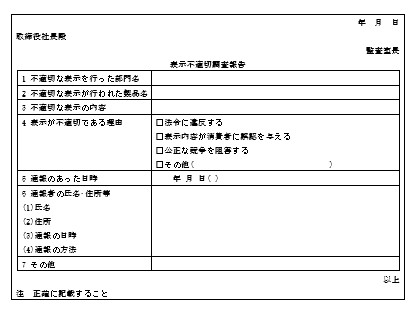 年 月 日 取締役社長殿 監査室長 表示不適切調査報告 1 不適切な表示を行った部門名 2 不適切な表示が行われた製品名 3 不適切な表示の内容 4 表示が不適切である理由 □法令に違反する □表示内容が消費者に誤認を与える □公正な競争を阻害する □その他( ) 5 通報のあった日時 年 月 日( ) 6 通報者の氏名·住所等 (1)氏名 (2)住所 (3)通報の日時 (4)通報の方法 7 その他 以上 注 正確に記載すること