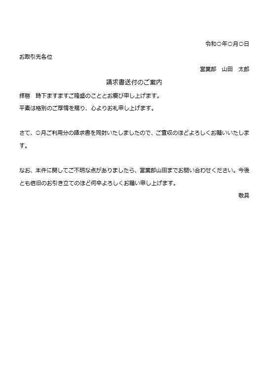 令和○年○月○日 お取引先各位 営業部 山田 太郎 請求書送付のご案内 拝啓 時下ますますご隆盛のこととお慶び申し上げます。 平素は格別のご厚情を賜り、心よりお礼申し上げます。 さて、○月ご利用分の請求書を同封いたしましたので、ご査収のほどよろしくお願いいたします。 なお、本件に関してご不明な点がありましたら、営業部山田までお問い合わせください。今後とも倍旧のお引き立てのほど何卒よろしくお願い申し上げます。 敬具