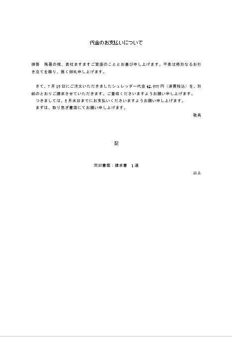 代金のお支払いについて 拝啓 残暑の候、貴社ますますご繁盛のこととお喜び申し上げます。平素は格別なるお引き立てを賜り、厚く御礼申し上げます。 さて、7月16日にご注文いただきましたシュレッダー代金42,500円(消費税込)を、別紙のとおりご請求させていただきます。ご査収くださいますようお願い申し上げます。 つきましては、8月末日までにお支払いくださいますようお願い申し上げます。 まずは、取り急ぎ書面にてお願い申し上げます。 敬具 記 同封書類:請求書 1通 以上