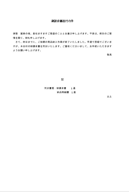 御請求書送付の件 拝啓 麗春の候、貴社ますますご隆盛のこととお喜び申し上げます。平素は、格別のご厚情を賜り、御礼申し上げます。 さて、昨日までに、ご依頼の商品納入作業が終了いたしました。早速で恐縮でございますが、本日付の御請求書を同封いたします。ご査収くださいまして、お手配いただきますようお願い申し上げます。 敬具 記 同封書類:御請求書 1通 納品明細書 1通 以上