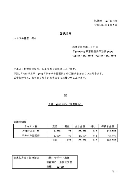 №請経 123-45-678 令和□□年4月6日 御請求書 コトブキ書店 御中 株式会社サポート出版 〒180-0001東京都豊島区池袋1-2-3 tel:03-1234-5678 fax:03-1234-5679 平素よりお世話になり、心より厚く御礼申し上げます。 下記、「片付け上手 100」「テキパキ整理術」のご請求をさせていただきます。 ご査収のうえ、お手配くださいますようにお願い申し上げます。 記 合計 ¥150,880-(消費税込) 御請求明細 テキスト名 定価 冊数 合計金額 掛け 御請求金額 片付け上手100 1,800 77 138,600 0.8 110,880 テキパキ整理術 1,000 50 50,000 0.8 40,000 合計 127 188,600 0.8 150,880 御支払方法:銀行振込 (株)サポート出版 新宿銀行 池袋北支店 当座 1234567 以上