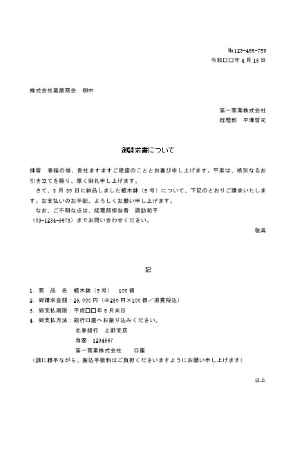 №123-456-789 令和□□年4月15日 株式会社葛飾商会 御中 第一商業株式会社 経理部 平澤哲司 御請求書について 拝啓 春暖の候、貴社ますますご隆盛のこととお喜び申し上げます。平素は、格別なるお引き立てを賜り、厚く御礼申し上げます。 さて、3月30日に納品しました植木鉢(8号)について、下記のとおりご請求いたします。お支払いのお手配、よろしくお願い申し上げます。 なお、ご不明な点は、経理部担当者 諏訪和子 (03-1234-5678)までお問い合わせください。 敬具 記 1.商 品 名:植木鉢(8号) 100個 2.御請求金額:25,000円(@250円×100個/消費税込) 3.御支払期限:平成□□年5月末日 4.御支払方法:銀行口座へお振り込みください。 北春銀行 上野支店 当座 1234567 第一商業株式会社 口座 (誠に勝手ながら、振込手数料はご負担くださいますようにお願い申し上げます) 以上