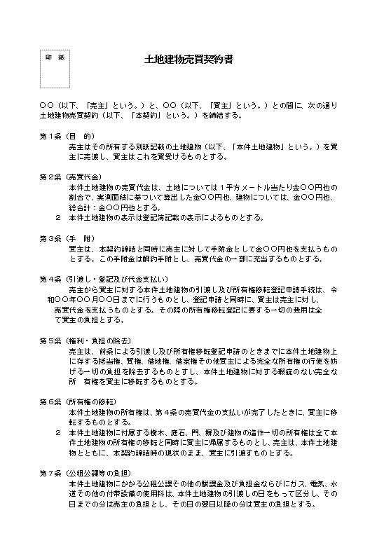 土地建物売買契約書 ○○(以下、「売主」という。)と、○○(以下、「買主」という。)との間に、次の通り土地建物売買契約(以下、「本契約」という。)を締結する。 第1条(目 的) 売主はその所有する別紙記載の土地建物(以下、「本件土地建物」という。)を買 主に売渡し、買主はこれを買受けるものとする。 第2条(売買代金) 本件土地建物の売買代金は、土地については1平方メートル当たり金○○円也の 割合で、実測面積に基づいて算出した金○○円也、建物については、金○○円也、 総合計:金○○円也とする。 2 本件土地建物の表示は登記簿記載の表示によるものとする。 第3条(手 附) 買主は、本契約締結と同時に売主に対して手附金として金○○円也を支払うもの とする。この手附金は解約手附とし、売買代金の一部に充当するものとする。 第4条(引渡し・登記及び代金支払い) 売主から買主に対する本件土地建物の引渡し及び所有権移転登記申請手続は、令和○○年○○月○○日までに行うものとし、登記申請と同時に、買主は売主に対し、 売買代金を支払うものとする。その際の所有権移転登記に要する一切の費用は全 て買主の負担とする。 第5条(権利・負担の除去) 売主は、前条による引渡し及び所有権移転登記申請のときまでに本件土地建物上に存する抵当権、質権、借地権、借家権その他買主による完全な所有権の行使を妨げる一切の負担を除去するものとすし、本件土地建物に対する瑕疵のない完全な所 有権を買主に移転するものとする。 第6条(所有権の移転) 本件土地建物の所有権は、第4条の売買代金の支払いが完了したときに、買主に移転するものとする。 2 本件土地建物に付属する樹木、庭石、門、塀及び建物の造作一切の所有権は全て本件土地建物の所有権の移転と同時に買主に帰属するものとし、売主は、本件土地建物とともに、本契約締結時の現状のまま、買主に引渡すものとする。 第7条(公租公課等の負担) 本件土地建物にかかる公租公課その他の賦課金及び負担金ならびにガス、電気、水 道その他の付帯設備の使用料は、本件土地建物の引渡しの日をもって区分し、その 日までの分は売主の負担とし、その日の翌日以降の分は買主の負担とする。 第8条(火災保険) 売主が、本件建物について現に付している 株式会社の火災保険契約(保険期間 令和○○年○○月○○日から令和○○年○○月○○日まで、保険金○○円也)にか かる権利は、第4条により売買代金全額の支払いを受けたときに買主に無償で譲 渡し、その火災保険契約の保険証券の証書(証券番号第○○番)および保険契約者・ 被保険者名義変更のための必要書類を買主に交付するものとする。 第9条(危険負担) 本契約締結後、第4条による本件土地建物の引渡しの完了前に、売主又は買主のい ずれかの故意又は過失によらないで本件土地建物の全部又は一部が火災、流出、陥 没その他により滅失又は毀損したとき、あるいは公用徴収、建築制限、道路編入等 の負担が課せられたときは、その損失は全て売主の負担とし、買主は売主に対して 売買代金の減額又は原状回復のために生ずる損害の賠償を請求することができる ものとする。 2 前項に定める滅失又は毀損により買主が本契約締結の目的が達することができないときは、買主はその旨を売主に書面でもって通告することにより本契約を解除することができるものとし、この場合、売主はすでに受取った手附金を全額買主に返還するものとする。 第10条(契約の解除・違約金) 売主又は買主は、その相手方が本契約に違反し、期限を定めた履行の催告に応じな い場合には、直ちに本契約を解除し、相手方に違約金として金○○円也の支払いを 請求することができるものとするが、買主による違約の場合には、売主は、すでに 受取った手附金をもって買主の支払うべき違約金に充当することができるものと する。 第11条(協議条項) 本契約に疑義を生じたとき、又はこの契約に定めなき事項があったときは、売主お よび買主が誠意をもって協議の上、これを決定するものとする。 以上の本契約を証するために、本書2通を作成し、売主及び買主が記名押印の上、各1通を保有する。 令和○○年○○月○○日 売主:住所 氏名 印 買主:住所 氏名 印