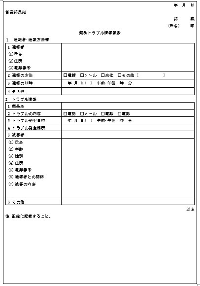 年 月 日 営業部長宛 部 課 (氏名) 印 製品トラブル情報報告 1 通報者·通報方法等 1 通報者 (1)氏名 (2)住所 (3)電話番号 2 通報の方法 □電話 □メール □来社 □その他( ) 3 通報の日時 年 月 日( ) 午前·午後 時 分 4 その他 2 トラブル情報 1 製品名 2 トラブルの内容 □電話 □メール □電話 □電話 3 トラブル発生日時 年 月 日( ) 午前·午後 時 分 4 トラブル発生場所 5 被害者 (1) 氏名 (2) 年齢 (3) 性別 (4) 住所 (5) 電話番号 (6) 通報者との関係 (7) 被害の内容 6 その他 以上 注 正確に記載すること。