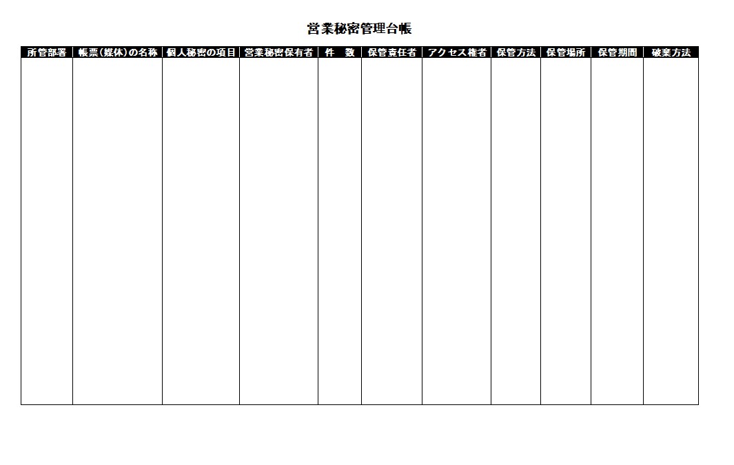 営業秘密管理台帳 所管部署 帳票(媒体)の名称 個人秘密の項目 営業秘密保有者 件 数 保管責任者 アクセス権者 保管方法 保管場所 保管期間 破棄方法